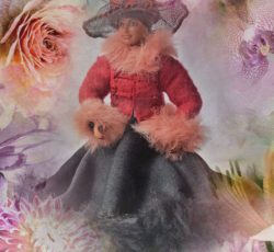 Figura realizada a partir de un maniqui de madelwoman vintage, con un vestido custom de tul sobre el que se ha ido pegando abalorios diferentes de uno en uno. Accesorios también custom