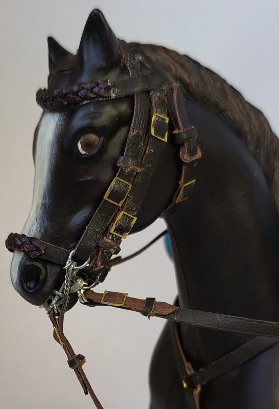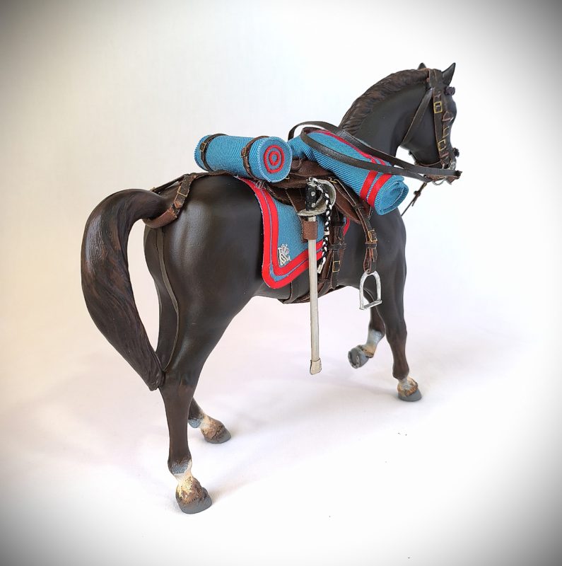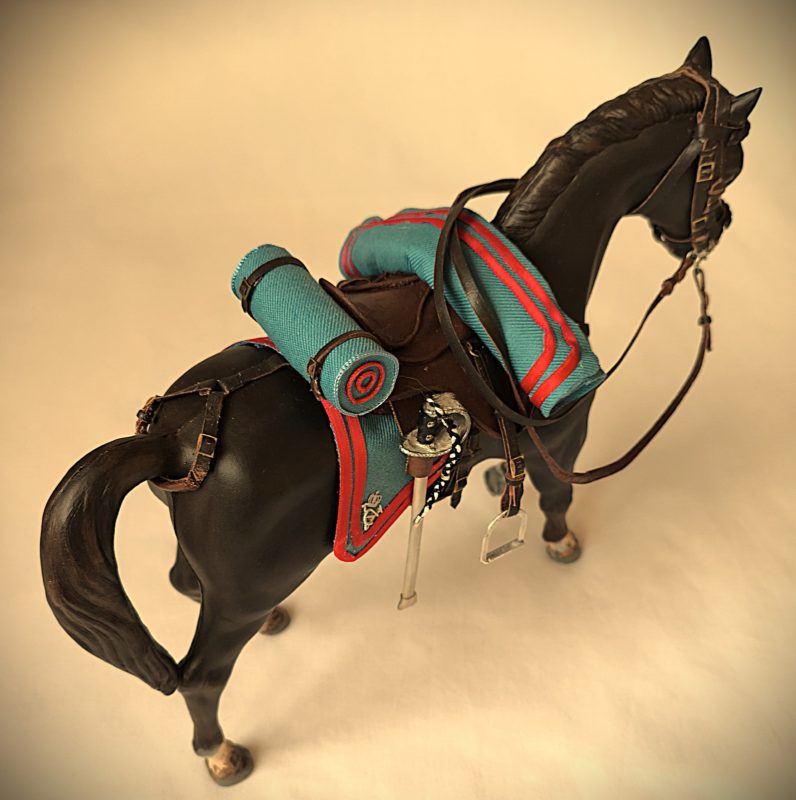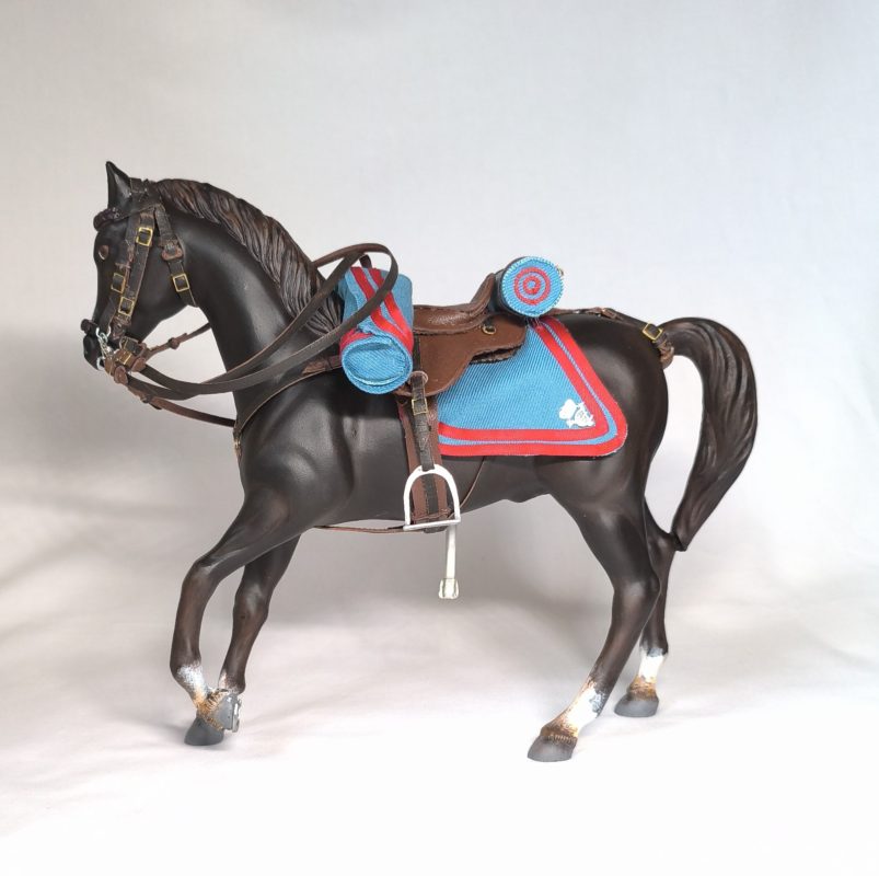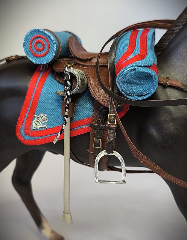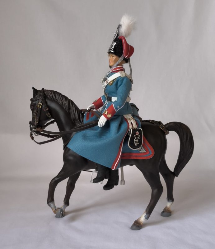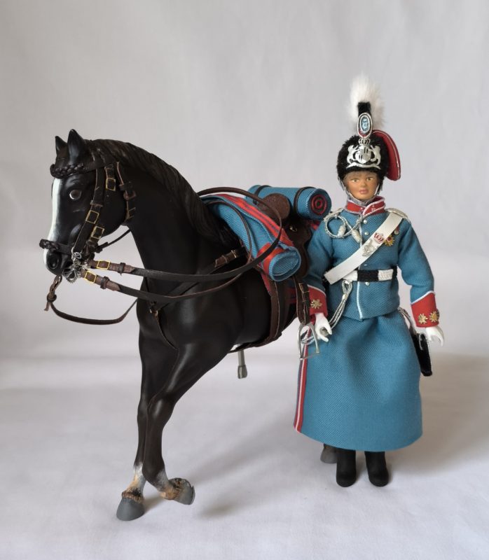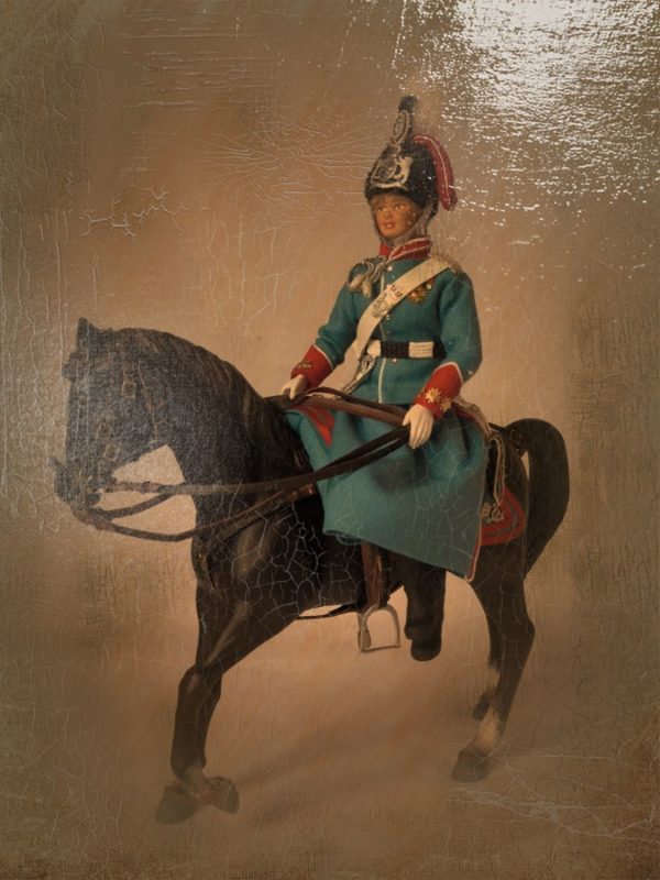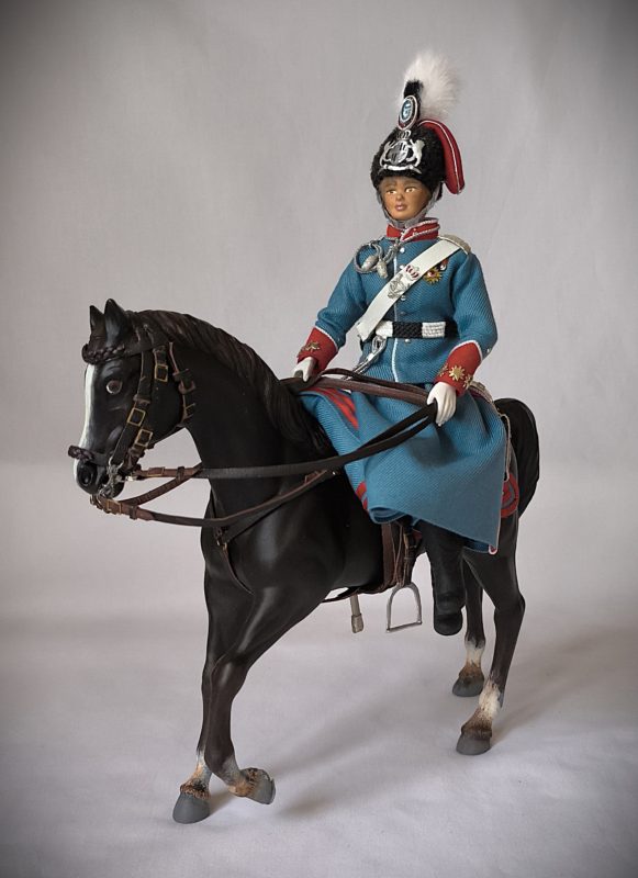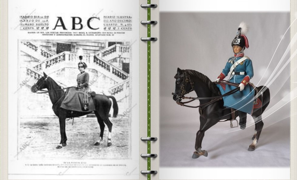 Figura que representa a la reina Victoria Eugenia en uniforme de caballería del regimiento de cazadores de Victoria Eugenia, en este caso a caballo.
